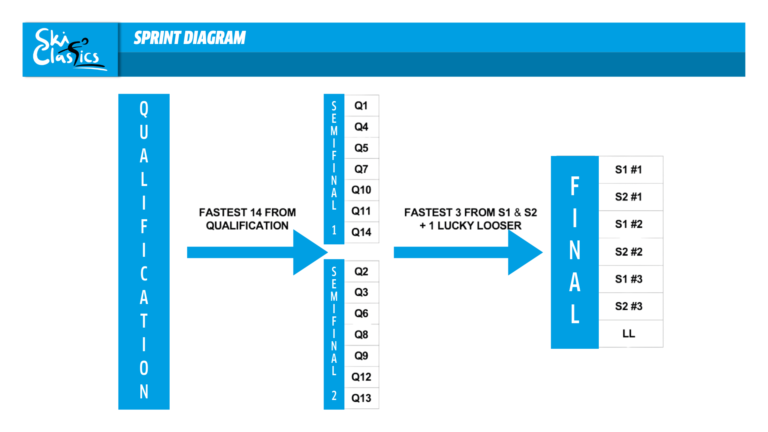 The format features individual starts in the prologue round, then with the top 14 advancing to the semi-finals, split into two heats of seven skiers. From there, the top three in each heat move on to the final, plus the best time for seventh place, where the lucky seven sprint specialists battle head-to-head for the victory.