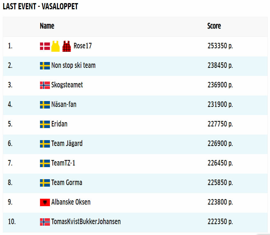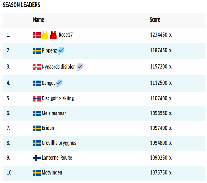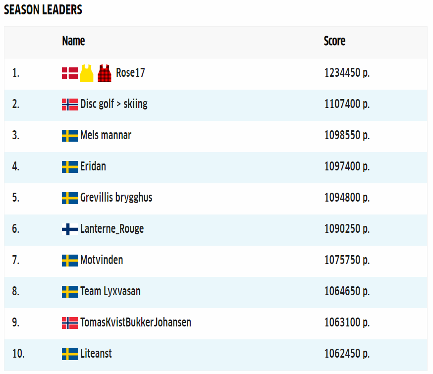 The overall leading player after Vasaloppet is Finn Livbjerg’s ‘Rose17’ team with 1.234.450 points, followed by Jørgen Madslien’s ‘Disc golf > skiing’ team with 1.107.400 points, and Mel361’s ‘Mels Mannar’ team in third place with 1.098.550 points.