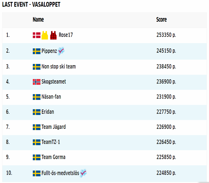 On Sunday, Vasaloppet saw the ‘Rose17’ team winning the Ski Classics Fantasy. Finn Livbjerg’s ‘Rose17’ team was ranked first with 253.350 points.