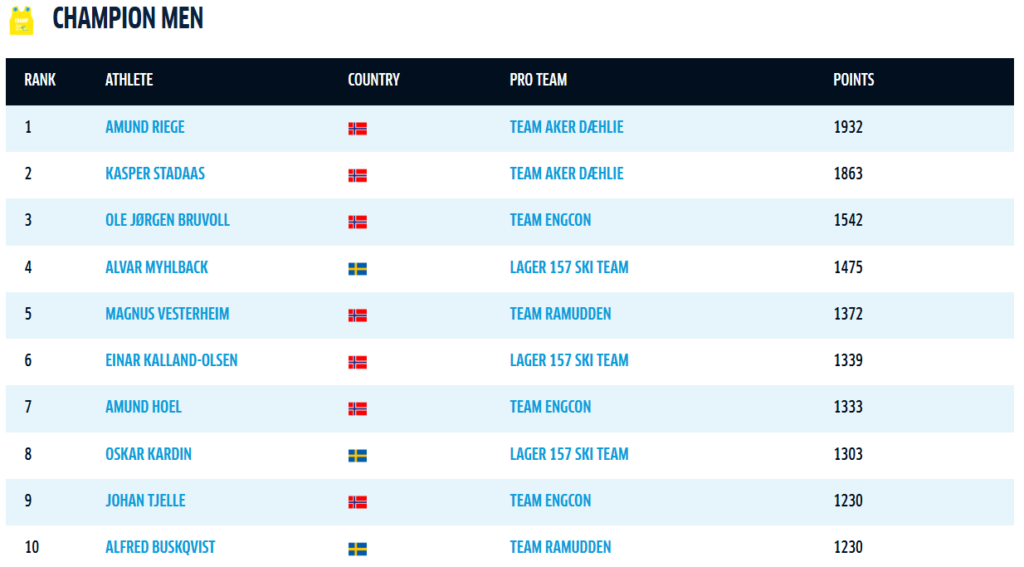 In the men’s battle for overall, the Yellow bib rests on Amund Riege’s shoulders. Riege, Team Aker Dæhlie, leads the Champion competition with 1932 points. Complete results from Amund Riege are available here.