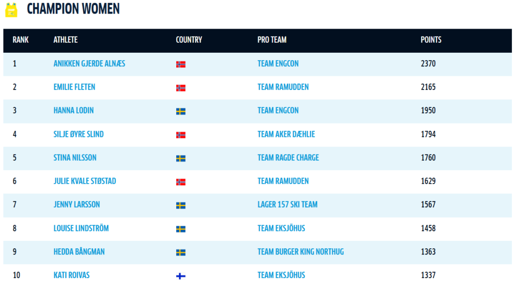 In the women’s overall, Anikken Gjerde Alnæs, Team Engcon, leads with a total of 2370 points. You can see complete results from Gjerde Alnæs here.