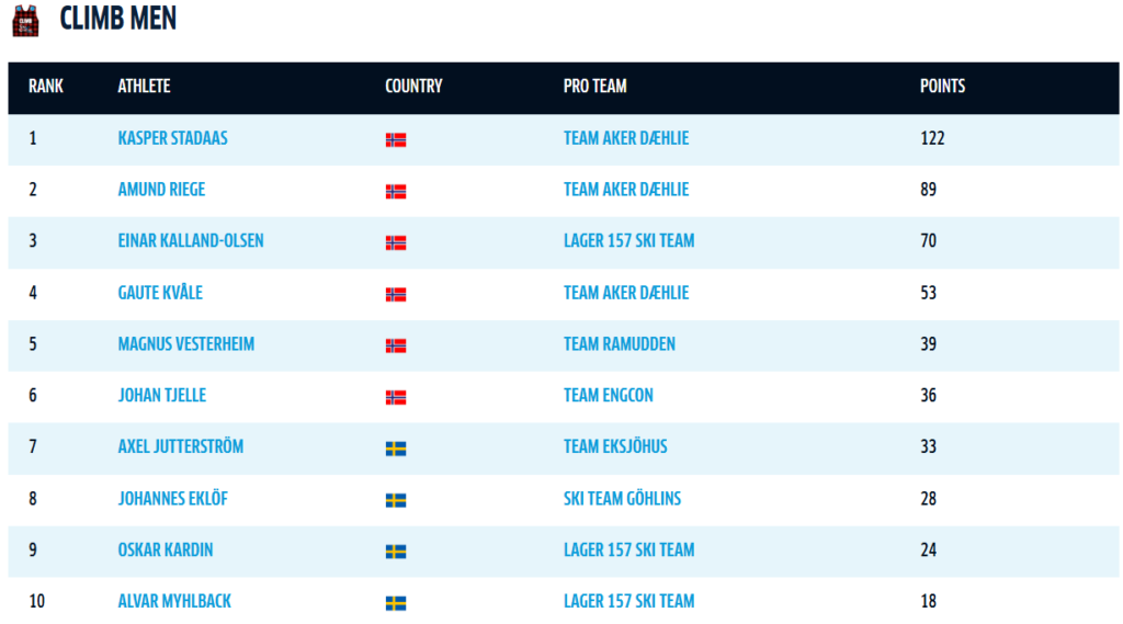 On the men’s side, Kasper Stadaas, Team Aker Dæhlie, leads the Climb competition with 122 points. Amund Riege, Team Aker Dæhlie, is in second place with 89 points, followed by Einar Kalland-Olsen, Lager 157 Ski Team, in third place, with 70 points.