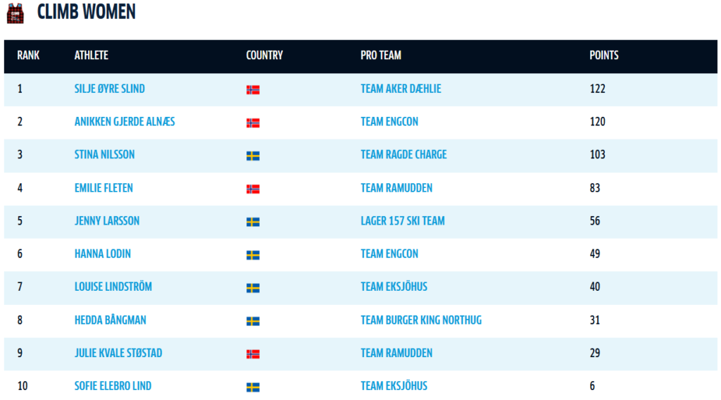 In the women’s Climb competition, Silje Øyre Slind, Team Aker Dæhlie, leads with 122 points. Anikken Gjerde Alnæs, Team Engcon, is in second place with 120 points, followed by Stina Nilsson, Team Ragde Charge, in third with 103 points.