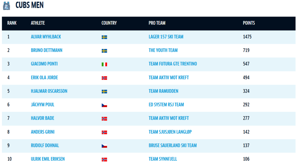 On the men’s side, Alvar Myhlback, Lager 157 Ski Team, is leading with 1475 points. Bruno Dettmann, The Youth Team, is in second place with 719 points, and Giacomo Ponti, Team Futura GTE Trentino, is in third place with 547 points in the Cub category.