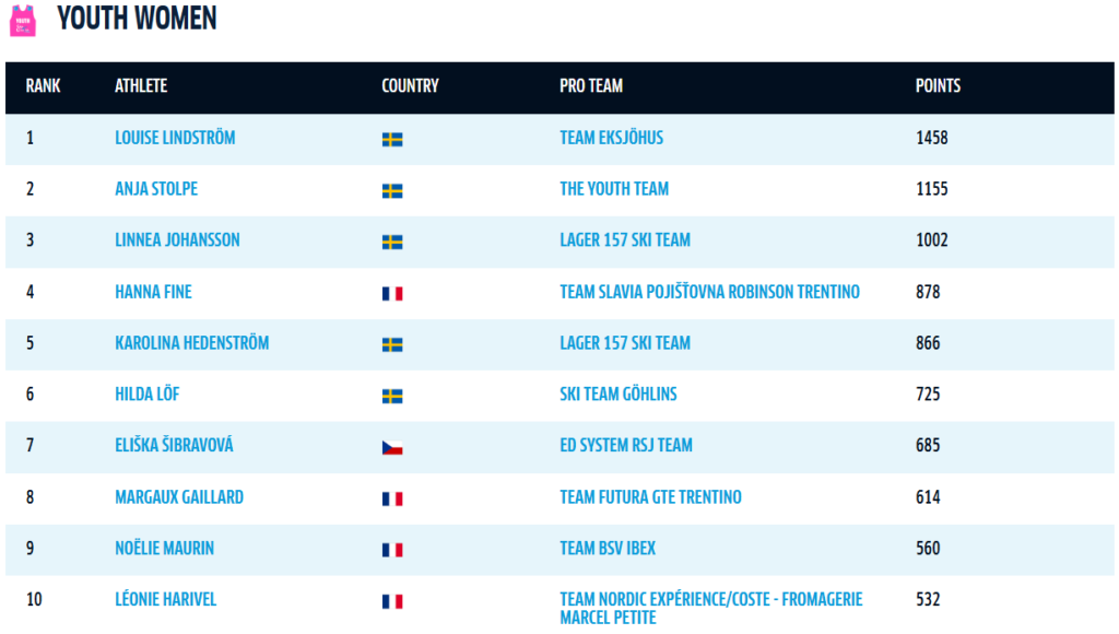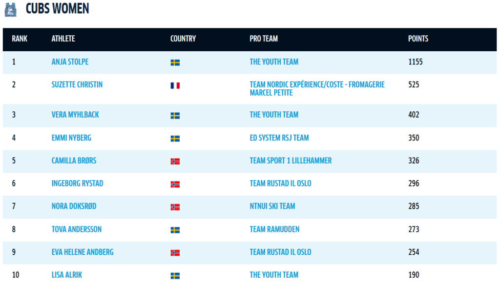 In the women’s Cub athlete category, Anja Stolpe, The Youth Team, is leading with 1155 points. Suzette Christin, Team Nordic Expérience/Coste – Fromagerie Marcel Petite, is in second place with 525 points, followed by Vera Myhlback, The Youth Team, in third place for the Cub category with 402 points.