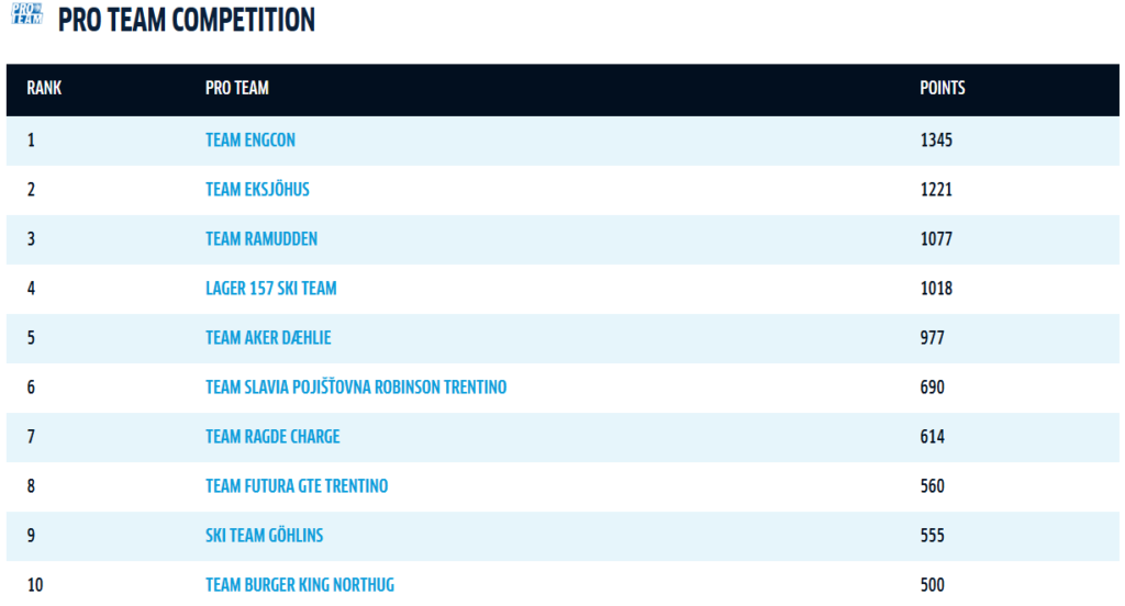 After the Orsa Grönklitt 50k ITT, Team Engcon leads the Pro Team Competition with 1345 points.