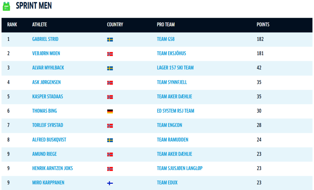 After the weekend, Gabriel Strid, Team GS8, carries the Green Sprint bib of the men’s Sprint competition with 182 points. Vebjørn Moen, Team Eksjöhus, is in second place with 181 points, followed by Alvar Myhlback, Lager 157 Ski Team, with 42 points in third place.