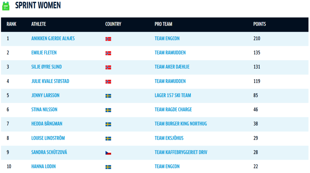 After the Sprint checkpoint last weekend, Anikken Gjerde Alnæs, Team Engcon, is the Green Sprint bib holder with 210 points. Emilie Fleten, Team Ramudden, is in second place with 135 points, and Silje Øyre Slind, Team Aker Dæhlie, is in third place with 131 points.