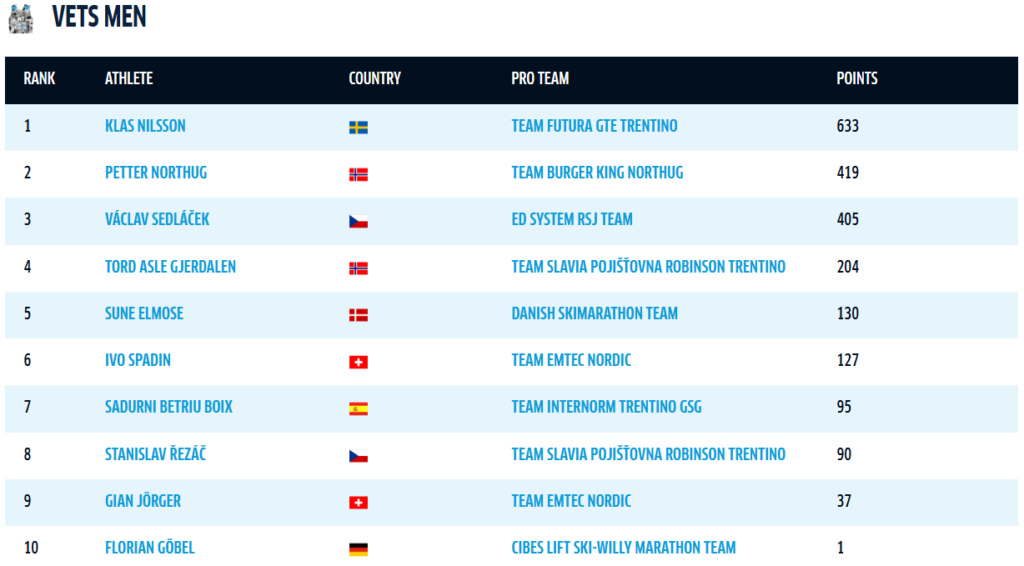 On the men’s side, Klas Nilsson, Team Futura GTE Trentino, is leading with 633 points. Petter Northug, Team Burger King Northug, is in second place with 419 points, and Václav Sedláček, eD system RSJ Team, is in third place in the Vet category with 405 points.