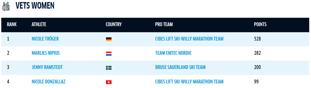 In the women’s Vet athlete category, Nicole Tröger, Cibes Lift Ski-Willy Marathon Team, is leading with 528 points. Marlies Nipius, Team Emtec Nordic, is in second place with 282 points, followed by Jenny Ramstedt, Bruse Sauerland Ski Team, in third place for the Vet category with 200 points.