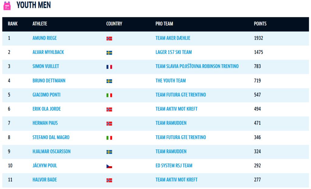 Amund Riege, Team Aker Dæhlie, leads with 1932 points. Alvar Myhlback, Lager 157 Ski Team, is in second place with 1475 points, and Simon Vuillet, Team Slavia Pojišťovna Robinson Trentino, is in third place with 783 points for the Youth bib overall.