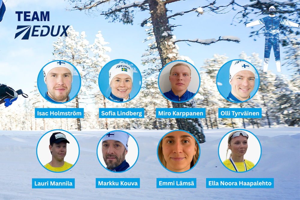 Led by Pro Team Director and athlete Olli Tyrvainen, Team Edux combines experience and youthful energy, with seven Finnish athletes and one Swede on the roster -- three women and five men: Ella Noora Haapalehto (2005), Emmi Lamsa (1998), Sofia Lindberg (1992), Isac Holmstrom (1995), Lauri Mannila (1998), Miro Karppanen (1998), Markku Kouva (1974), and Olli Tyrvainen (1993).